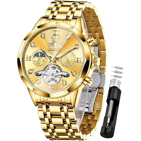 OLEVS Herren-Automatikuhr, Diamant-Skelett, mechanisch, luxuriös, selbstaufziehend, Mondphasenkalender, wasserdichte Armbanduhr für Herren, G6621: Goldfarbenes Band und goldenes Zifferblatt