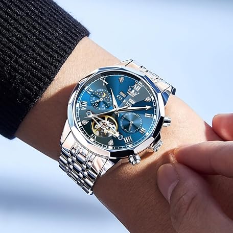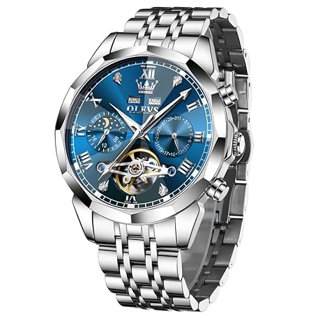 Sản phẩm OLEVS Men's Automatic Watch Skeleton Moon Phase Dial Luxury Dress Stainless Steel Strap 5 Hands Diamond Men Wrist Watches đang được bán với giá ưu đãi là $189.0932 tại nước Đức.