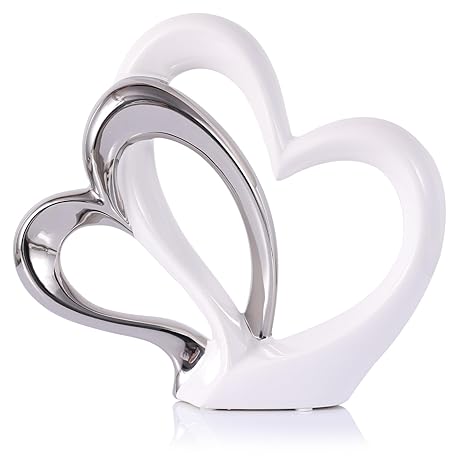 oliruim Herzförmige Statuen-Dekoration, Keramik-Doppelherz, Silber-Weiß, Skulptur für Heimdekoration, TV-Ständer, Dekorationsartikel für Wohnzimmer, Eingangsbereich, Tischdekoration,