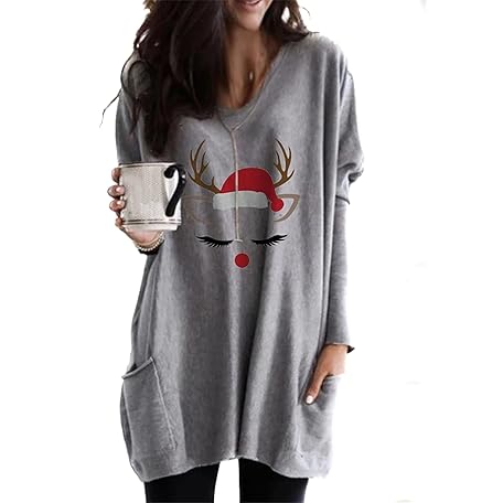 OMZIN Frauen Weintasse Weihnachtsmütze Grafikdruck Pailletten Print Sweatshirt Pullover Sweatshirts Mittelgrau XL
