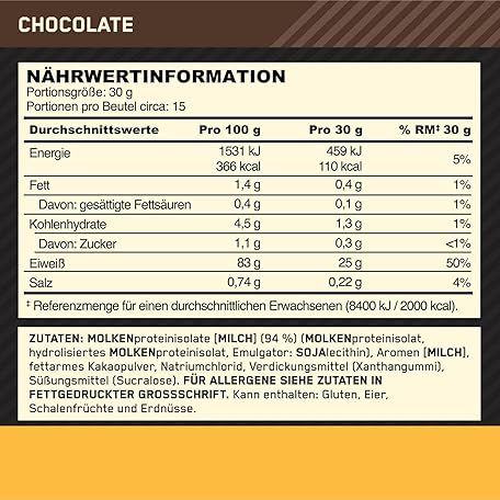 Thông tin sản phẩm Optimum Nutrition Gold Standard 100% Whey Protein Isolate Powder, Chocolate Flavour, 450 g, 15 Servings