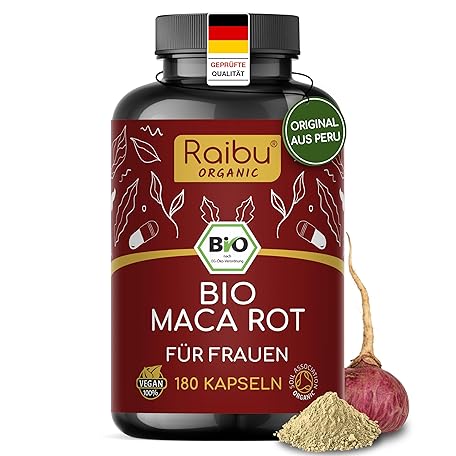 Organic Maca Red, 180 Capsules - 3,200 mg per Daily Dose (Equivalent to 12,800 mg Maca Root from Peru) for Women - With Natural Vitamin C from Acerola - High Dose, Vegan & Laboratory Tested