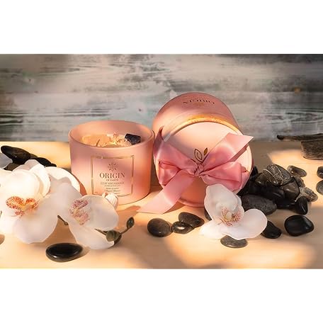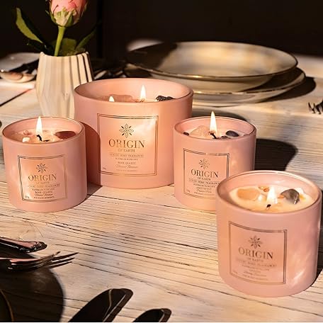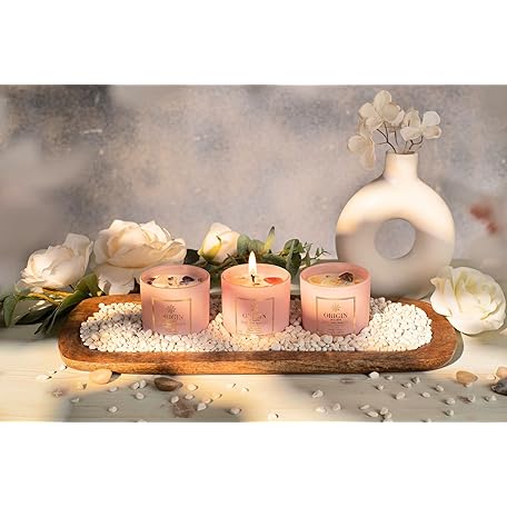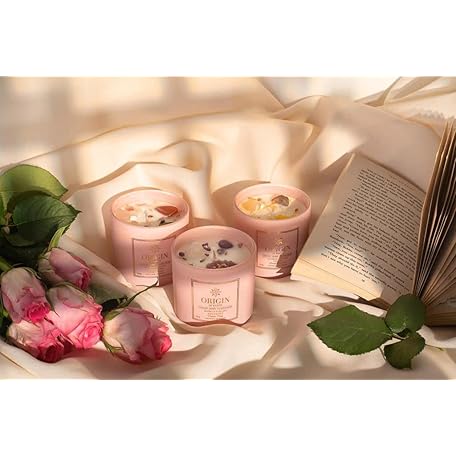 Thông tin sản phẩm ORIGIN OF EARTH Scented Candles in Glass (Set of 3) 360 g, Collection Love Candle with Crystals and Gemstone, Natural Soy Wax Candle, 60 Hours Burning Time, with Sweet Fresh Fragrances