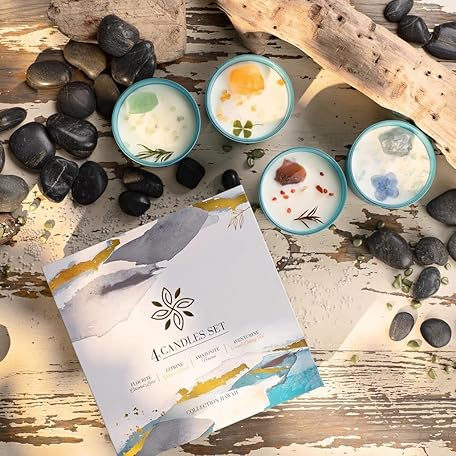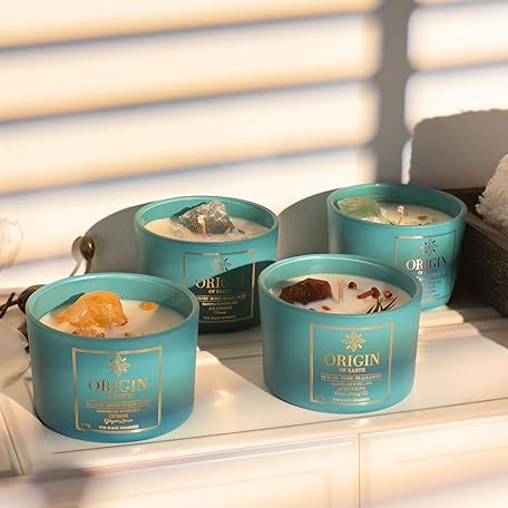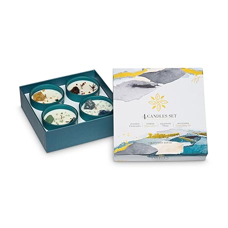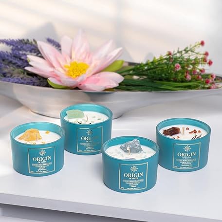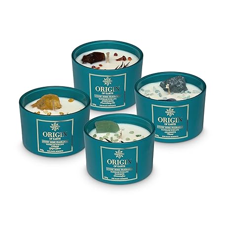 Sản phẩm ORIGIN OF EARTH Scented Candles in Glass (Set of 4) 400 g, Collection Hawaii, Candles with Crystals and Gemstone, Natural Soy Wax Candle, 60 Hours Burning Time, with Summery Exotic Fragrances đang được bán với giá ưu đãi là $48.8429 tại nước Đức.