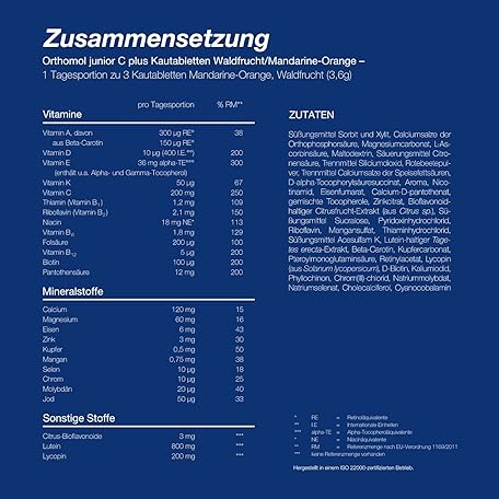 Thông tin sản phẩm Orthomol Junior C plus 14 Chewable Tablets for Children, Vitamins and Trace Elements, Dietary Supplement for the Immune System