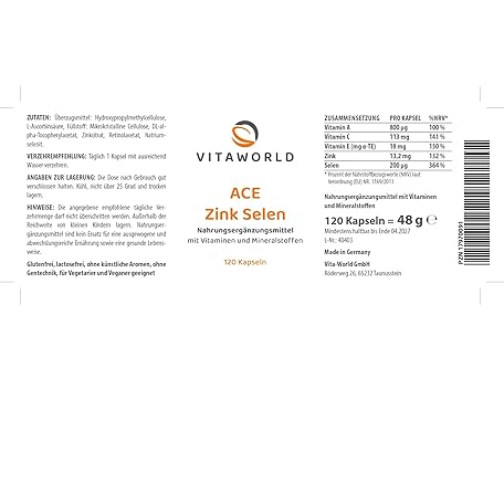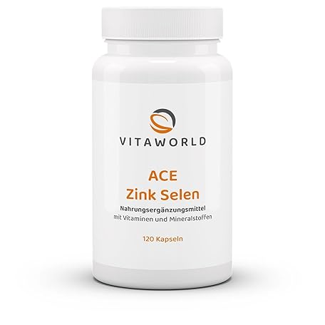 Sản phẩm Pack of 3 Vita World ACE Zinc + Selenium 3 x 120 Capsules Vegan Supplemented with Vitamins A, C and E in Optimal Dosage Pharmacy Manufacturing đang được bán với giá ưu đãi là $47.9491 tại nước Đức.