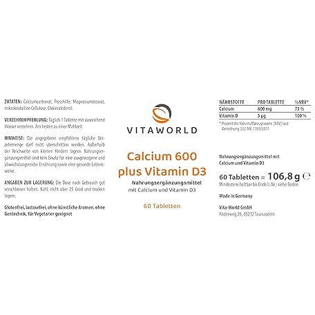 Sản phẩm Pack of 3 Vita World Calcium 600 mg plus Vitamin D 3 x 60 Vegetarian Tablets Made in Germany đang được bán với giá ưu đãi là $38.5315 tại nước Đức.