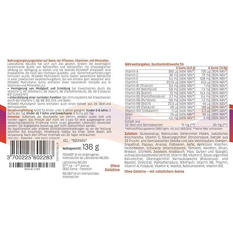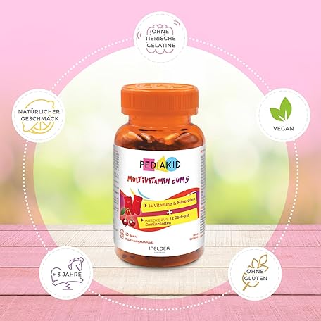 Sản phẩm PEDIAKID - Multivitamin Gums - Natural formula with delicious cherry aroma - Helps reduce fatigue - Supports the body's natural defenses - 60 chewing gums đang được bán với giá ưu đãi là $20.165 tại nước Đức.
