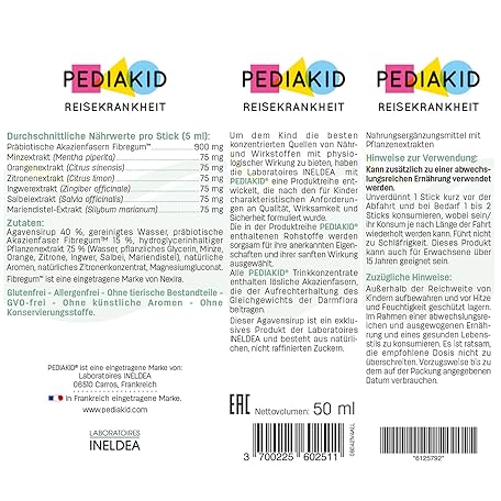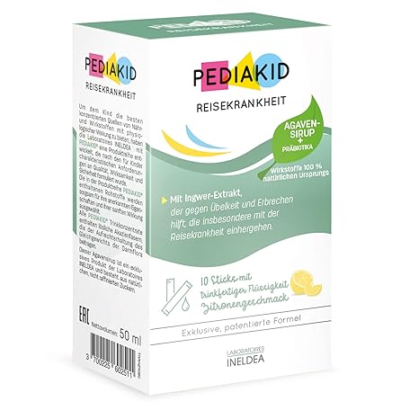 Sản phẩm PEDIAKID - Travel sickness - Dietary supplement with extracts of ginger, milk thistle, lemon and orange - Helps prevent and fight nausea and vomiting - 10 sticks đang được bán với giá ưu đãi là $21.3967 tại nước Đức.