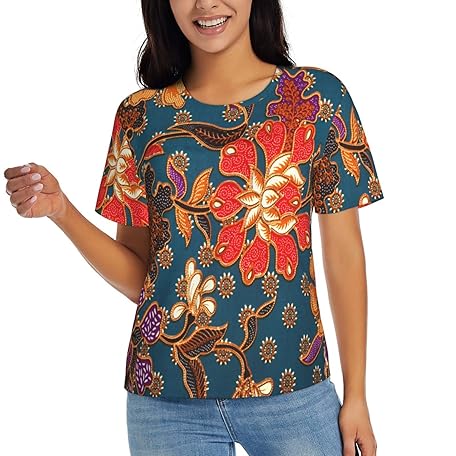 Peiyeety Malaysisches und indonesisches Batik-Damen-Kurzarm-T-Shirt. Ultraweiches T-Shirt mit Rundhalsausschnitt