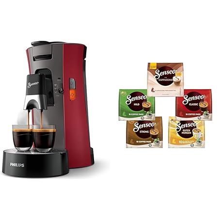 Philips Senseo Select Kaffeepadmaschine Bundle mit 66 Kaffeepads,3 Kaffeespezialitäten, Memo-Funktion, Crema Plus, Intensität Plus, aus recyceltem Plastik, 0,9L, Rot (CSA240/90)