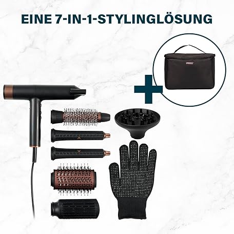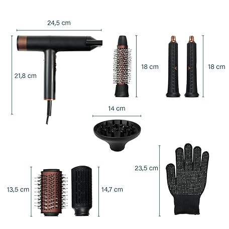 Thông tin sản phẩm Princess Airstyler Pro, 7-in-1 Styling Tool, 3 Heat & Speed Levels, Ion Function, Coolshot, 1.8 m Cable, Travel Bag, 7 Attachments, Heat Protection Glove, BLDC Motor, 2000 W, 01.529205.01.001