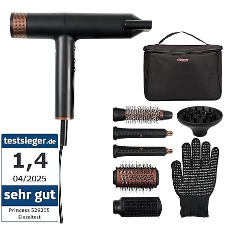 Sản phẩm Princess Airstyler Pro, 7-in-1 Styling Tool, 3 Heat & Speed Levels, Ion Function, Coolshot, 1.8 m Cable, Travel Bag, 7 Attachments, Heat Protection Glove, BLDC Motor, 2000 W, 01.529205.01.001 đang được bán với giá ưu đãi là $77.7497 tại nước Đức.