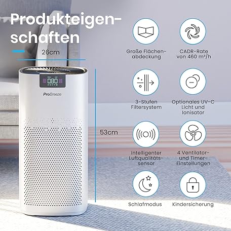 Thông tin sản phẩm Pro Breeze Luftreiniger Hepa 13 Filter mit UV-C Lampe, Luft Ionisierer & Aktivkohlefilter, CADR 460m3 - Air Purifier mit Luftqualitätsmesser für große Räume bis 140m² - bis zu 99.95% Filterleistung