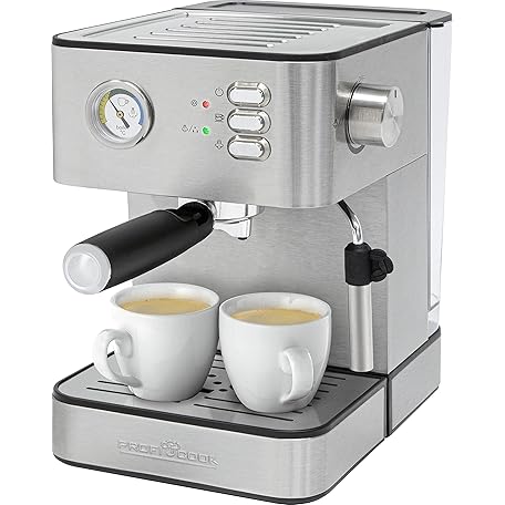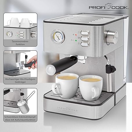 Sản phẩm Profi Cook Espresso Machine, Espresso Machine, Coffee, 20 Bar, Stainless Steel Housing, Water Tank 1.8 Litres (Removable), Stainless Steel Steam Nozzle with Frothing Function, Cup Preheating Function, đang được bán với giá ưu đãi là $134.8112 tại nước Đức.