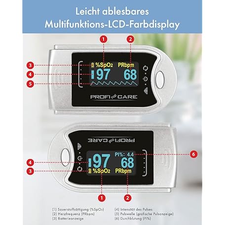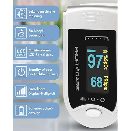 Thông tin sản phẩm ProfiCare® Pulse Oximeter Finger Oximeter for Measuring Pulse and Oxygen Saturation on the Finger, 3-in-1 for Measuring Pulse, Oxygen Saturation and Perfusion Index, Oximeter Finger Clip PC-PO 3104