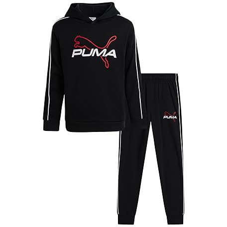 PUMA Jungen-Sweathosen-Set – 2-teiliges Fleece-Pullover-Kapuzen-Sweatshirt und Jungen-Jogginghose, Jugendliche, Kinder, Activewear-Set (8–16), Schwarz/rote Katze, 14-16