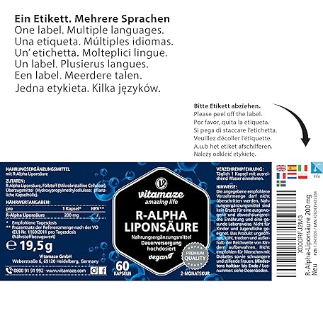 Thông tin sản phẩm R-Alpha Lipoic Acid High Dosage, 200 mg per Capsule, Vegan, 2 Month Treatment, Natural Form of Thioctic Acid, Quality Product, Bioactive Dietary Supplement without Unnecessary Additives, Made in Germany