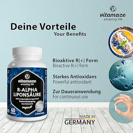 Sản phẩm R-Alpha Lipoic Acid High Dosage, 200 mg per Capsule, Vegan, 2 Month Treatment, Natural Form of Thioctic Acid, Quality Product, Bioactive Dietary Supplement without Unnecessary Additives, Made in Germany đang được bán với giá ưu đãi là $25.5496 tại nước Đức.