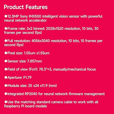 Thông tin sản phẩm RaspberyPi Official AI Camera 12MP, IMX500 Intelligent Vision Sensor, 78.3°FOV Based on The IMX500 Intelligent Vision Sensor Compatible with Pi5/4B (RPi AI Camera)