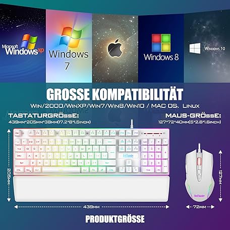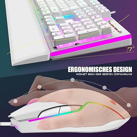 Thông tin sản phẩm RedThunder K10 Gaming Keyboard and Mouse Set, QWERTZ DE Layout, Metal Plate and Wrist Rest, RGB Backlight - and 7D with Ergonomic - for PC Mac Gamer (White)