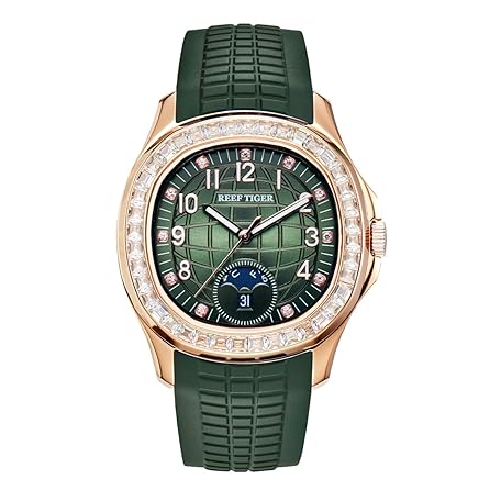 REEF TIGER Luxury Men's Rose Gold Diamond Square Blue Dial Multifunction Luminous Rubber Band Sports Watch RGA1805 (RGA1805-PNNRD), RGA1805-PNNRD, Mechanical, Rga1805-pnnrd, Mechanical, self-winding,