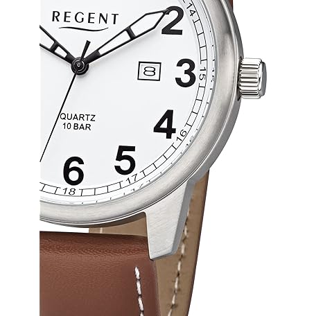 Thông tin sản phẩm REGENT Men's Watch with Leather Strap, Stainless Steel Case, Waterproof, 10 ATM, Screw-Down Crown, Arabic Numbers, Quartz, Date