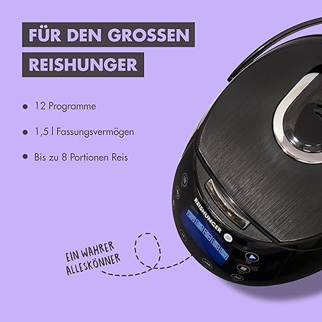 Sản phẩm REISHUNGER Digital Rice Cooker and Steamer Black | 1.5 litres for 8 People | Keep Warm Function, Timer and Premium Inner Pot | Multi Cooker, 12 Programmes, 7-Phase Technology đang được bán với giá ưu đãi là $196.1891 tại nước Đức.