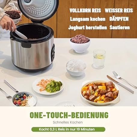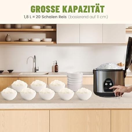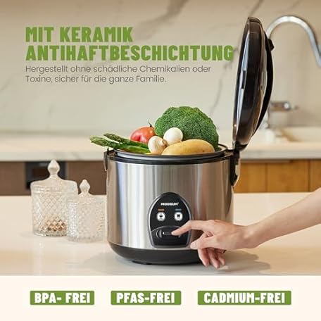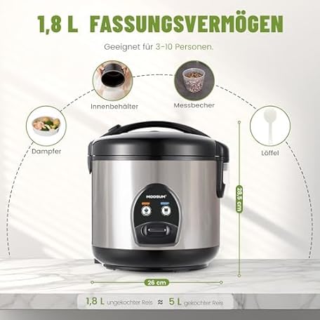 Sản phẩm Rice Cooker with Ceramic Coating - 1.8 L Large Capacity - For 2-10 People - Includes Steamer - Keep Warm Function, Rice Spoon and Measuring Cup - Silver đang được bán với giá ưu đãi là $75.6351 tại nước Đức.