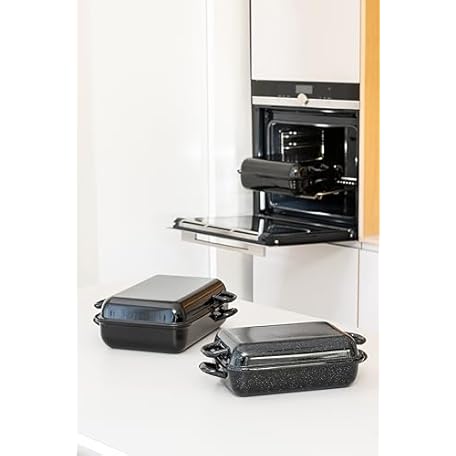 Thông tin sản phẩm Riess, 0104-022, Bratpfanne mit Deckel 32/22, CLASSIC BACK- UND BRATFORMEN, Länge 32 cm, Breite 22 cm, Höhe 11.6 cm, Emaille, schwarz, Bräter, Ofenpfanne, Induktion, Bratreine