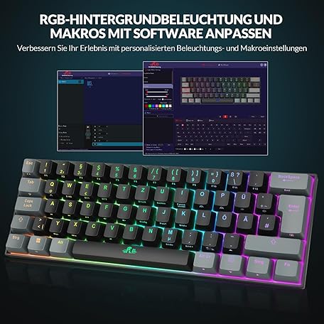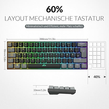 Thông tin sản phẩm Rii Mechanical Gaming Keyboard, 60% Wireless RGB Illuminated Keyboard with Red Switch and N-Key Rollover for PC/Laptop/PS4/PS5, QWERTZ, Black/Grey (Bluetooth/2.4G/Cable)