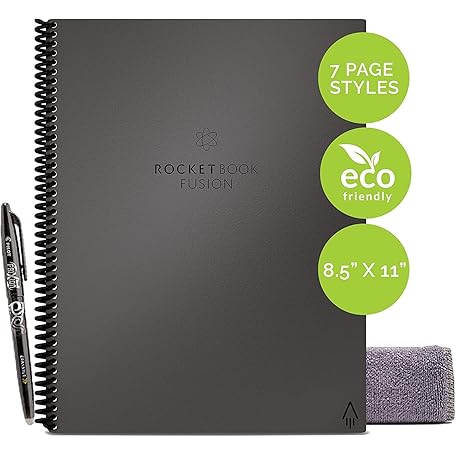 Rocketbook Fusion Wiederverwendbares Notizbuch, Smart Notepad A4 Grau, 7 Layouts, To Do Listen, Daily Bullet Journal, Monats- oder Wochenübersicht, inklusive Pilot FriXion Stift, Reduziert Papiermüll