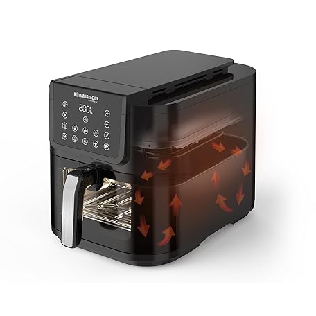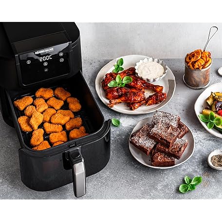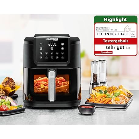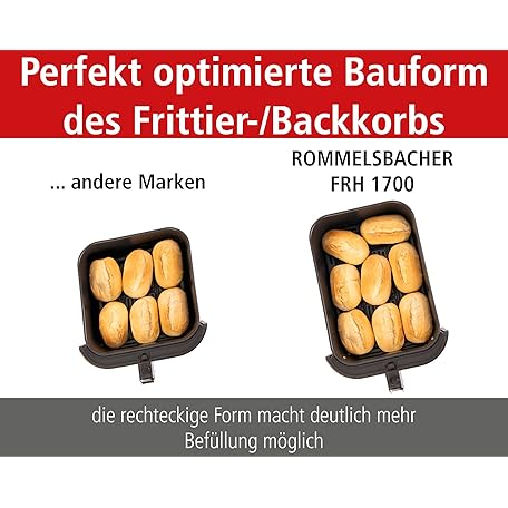 Thông tin sản phẩm ROMMELSBACHER FRH 1700 Hot Air Fryer, XXL Baking Chamber 8 Litres (approx. 21 x 30 cm) for 1,000 g Chips, Very Quiet Operation 45 dB (A), 10 Programmes, 60-200 °C, Large Viewing Window with Interior