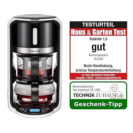 Thông tin sản phẩm ROMMELSBACHER Tea Machine TA 1200 – 5 Programmes, 4 Brewing Temperatures (80/85/90/100 °C), Brewing Time up to 10 Minutes, Warming Function, Start Time Delay, Glass Teapot, Stainless Steel Tea Strainer, 1200 W