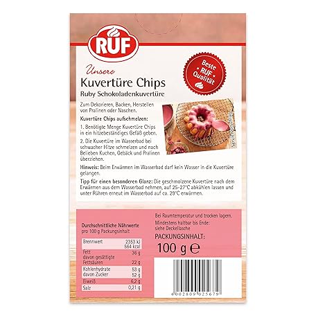 Thông tin sản phẩm RUF Ruby Chocolate Chips Pink Chocolate from Ruby Cocoa Bean for Glazing & Decorating Cakes, Tarts & Chocolates, Gluten Free, 1 x 100 g