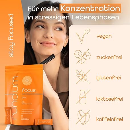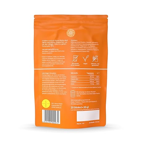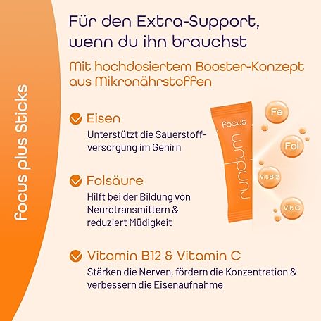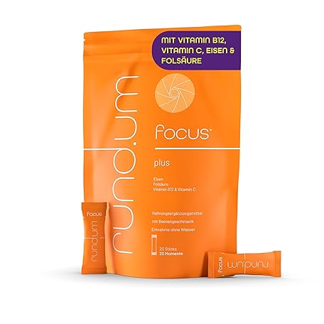 Thông tin sản phẩm rund.um Focus Sticks - Iron, Folic Acid, Vitamin B12 & Vitamin C - Practical Portion Sticks for More Concentration, Focus & Energy in Everyday Life - Dietary Supplement - Pack of 20