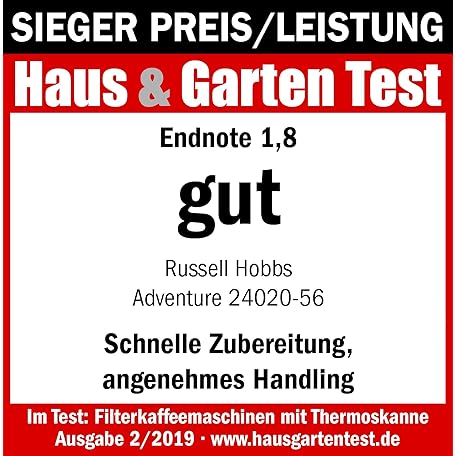 Sản phẩm Russell Hobbs Adventure Coffee Machine [Shower Head for Optimal Extraction and Aroma] (1 to 8 Cups, 1.0 L Thermal Jug, Automatic Shut-Off, Drip Stop, 1100 W) Filter Coffee Machine 24020-56 đang được bán với giá ưu đãi là $57.5193 tại nước Đức.