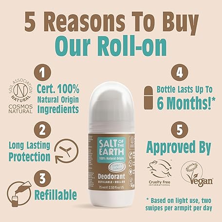 Thông tin sản phẩm Salt Of the Earth Deodorant Roll On by Salt of the Earth, Ginger & Jasmine - Refillable, Vegan, Long Lasting Protection, Leaping Bunny Approved, Made in the UK - 75 ml