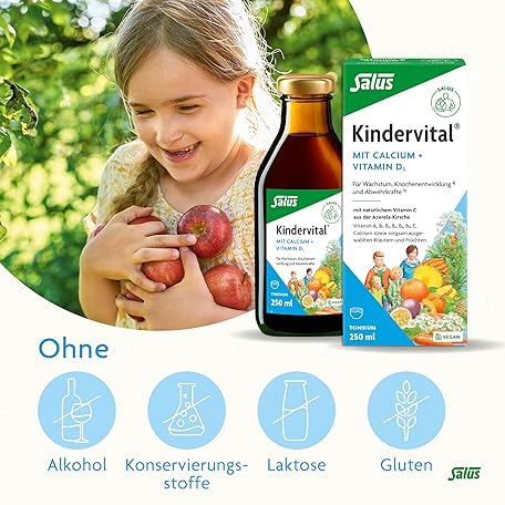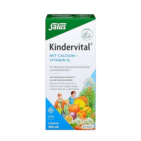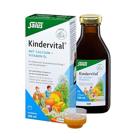 Sản phẩm Salus Kindervital with Calcium + Vitamin D3-1 x 250 ml - Tonic for Growth, Bone Development a) and Defences b) - with 9 Vitamins and Calcium - Vegan đang được bán với giá ưu đãi là $15.8377 tại nước Đức.