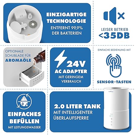 Thông tin sản phẩm SANICUR Air Disinfectant - Decomposes Pollen, Bacteria, Viruses & Odours - Air Purifier without Chemicals & HEPA Filter - Air Sterilisation with Water Only - Quiet & Effective - Allergy Sufferers and