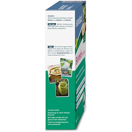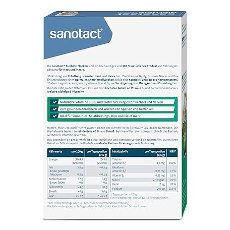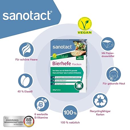 Thông tin sản phẩm sanotact Brewer's Yeast Flakes (100 g) • 100% Natural Beer Yeast Flakes • Yeast Flakes with Biotin & 5 B Vitamins for Skin, Hair, Nails • Ideal for Cooking as Vegan Parmesan & for Seasoning