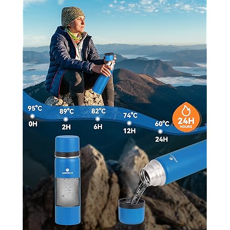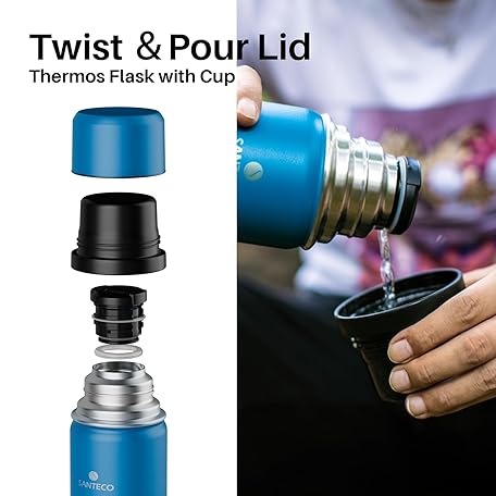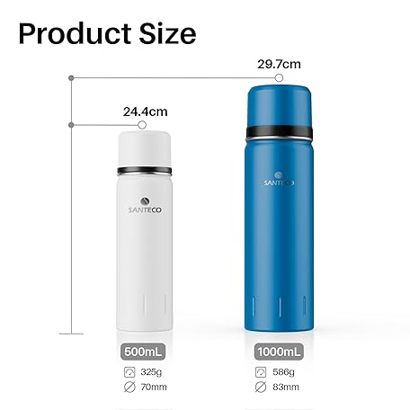 Thông tin sản phẩm SANTECO Thermos Flask, Stainless Steel, 1 L, 500 ml, Leak-Proof Insulated Bottle with Drinking Cup for Travel, Coffee & Tea for Children, Sports, BPA-Free, 24 Hours Cold & 12 Hours Hot