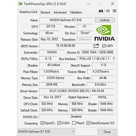 Sản phẩm SAPLOS Geforce GT 610 Grafikkarte, 2GB DDR3 64-bit, VGA HDMI, Low Profile grafikkarte, PCI Express x16, DirectX 11 đang được bán với giá ưu đãi là $65.1711 tại nước Đức.