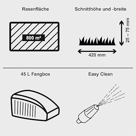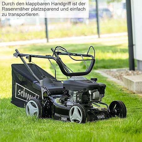 Thông tin sản phẩm Scheppach MS132-42B Petrol Lawnmower Black Edition with Drive, for Lawns up to 800 m², Cutting Width 42 cm, Power 3.3 HP, Cutting Height Adjustment in 7 Levels (25-75 mm), Collection Box 45 L