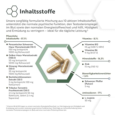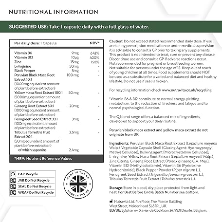 Thông tin sản phẩm Schwarzer Maca Komplex 6000mg mit Zink Ginseng, Bockshornklee, L Arginin, Vitamin B6 & Vitamin B12 für Energiestoffwechsel und Psychischen Funktion (EFSA) 180 Maca Kapseln für 6 Monate - Nutravita