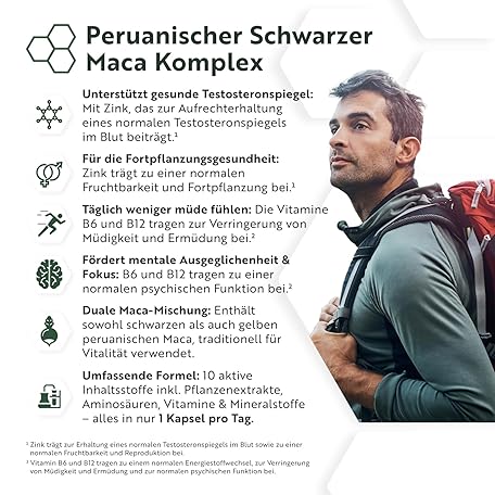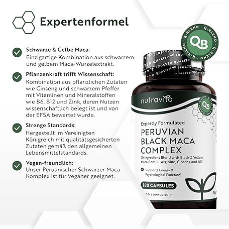 Sản phẩm Schwarzer Maca Komplex 6000mg mit Zink Ginseng, Bockshornklee, L Arginin, Vitamin B6 & Vitamin B12 für Energiestoffwechsel und Psychischen Funktion (EFSA) 180 Maca Kapseln für 6 Monate - Nutravita đang được bán với giá ưu đãi là $25.397 tại nước Đức.