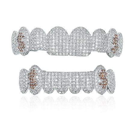 • Set Aus 8 Vergoldeten, Funkelnden Grillz-ZäHnen mit LuxuriöSen Zirkonia-Simulanten für Den Hip-Hop-Look(Silver brown)