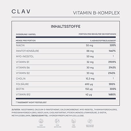 Thương hiệu CLAV là cái tên nổi tiếng được rất nhiều khách hàng trên thế giới chọn lựa. Với kiểu dáng đẹp mắt, sang trọng, sản phẩm Set of 2 Vitamin B Complex High Dose Vegan All Eight B Vitamins & Co-Factors 240 Capsules (8 Months) Vit B1, B2, B3, B5, B6, B12 Methylcobalamin, Biotin & Folic Acid, Myo-Inositol & Choline là sự lựa chọn hoàn hảo nếu bạn đang tìm mua một món cho riêng mình.