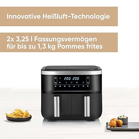 Sản phẩm SEVERIN Double Hot Air Fryer with 2 x 3.8 L Cooking Space, XXL Hot Air Fryer for Healthy Cooking, 8 Automatic Programmes, Fryer without Fat with Drying Function, 2850 W, Black/Silver, FR 2453 đang được bán với giá ưu đãi là $114.9078 tại nước Đức.