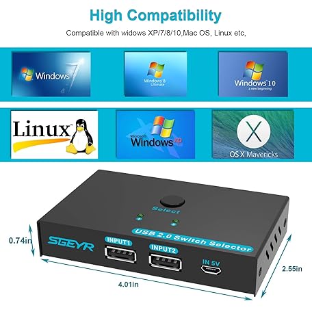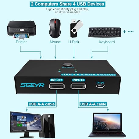 Thông tin sản phẩm SGEYR 4 Ports USB 2.0 Switch 2 in 4 Out USB Switch with 2 USB Cable Kits for 4 USB Parts 2 PCs for Printers, Scanners, Keyboards, USB Sticks, Hard Drives, Mouse etc